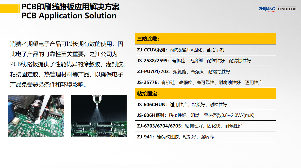 之江公司立足于中國膠粘劑行業領軍企業和有機硅、聚氨酯、環氧等專業膠粘劑的創新和產業化優勢,具有國家高新技術企業和國家級企業技術中心資質,依靠國家級CNAS實驗室以及國家級博士后科研工作站,并有國際專家助力,為PCB印刷線路板的三防涂敷、粘接固定、導熱灌封等提供系統用膠解決方案。其中,關鍵產品如下: