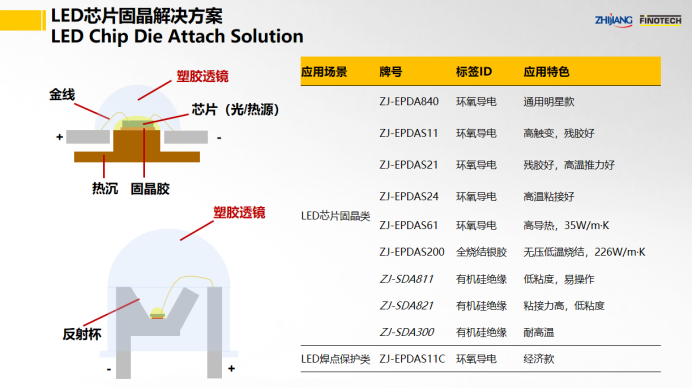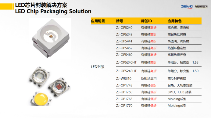 之江公司立足于中國膠粘劑行業領軍企業和有機硅、聚氨酯、環氧等專業膠粘劑的產業化優勢,具有國家級高新技術企業和國家級企業技術中心資質,依靠國家級CNAS實驗室以及國家級博士后科研工作站,并有國際專家助力,為LED封裝行業提供高性能的固晶和封裝解決方案。其中,關鍵產品如下: